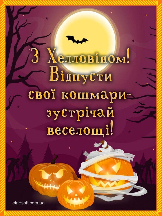 Вітаю з Хелловіном! Бажаю відпустити на волю всі страхи, веселитися до втрати пульсу, сміятися до сліз, танцювати до упаду і дуріти до жаху! А ще бажаю страшної краси, кошмарного везіння та потворно липучої удачі!