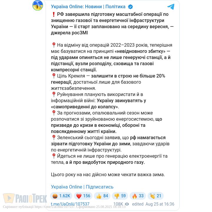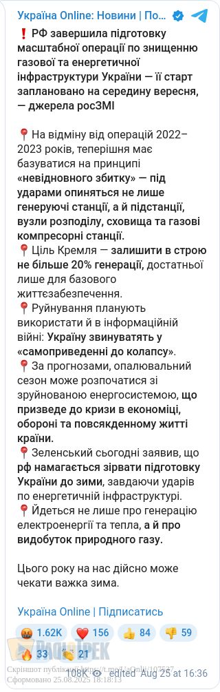 - РФ завершила підготовку масштабної операції по знищенню газової та енергетичної інфраструктури України – її старт заплановано на середину вересня, - джерела росЗМІ