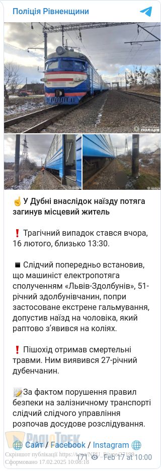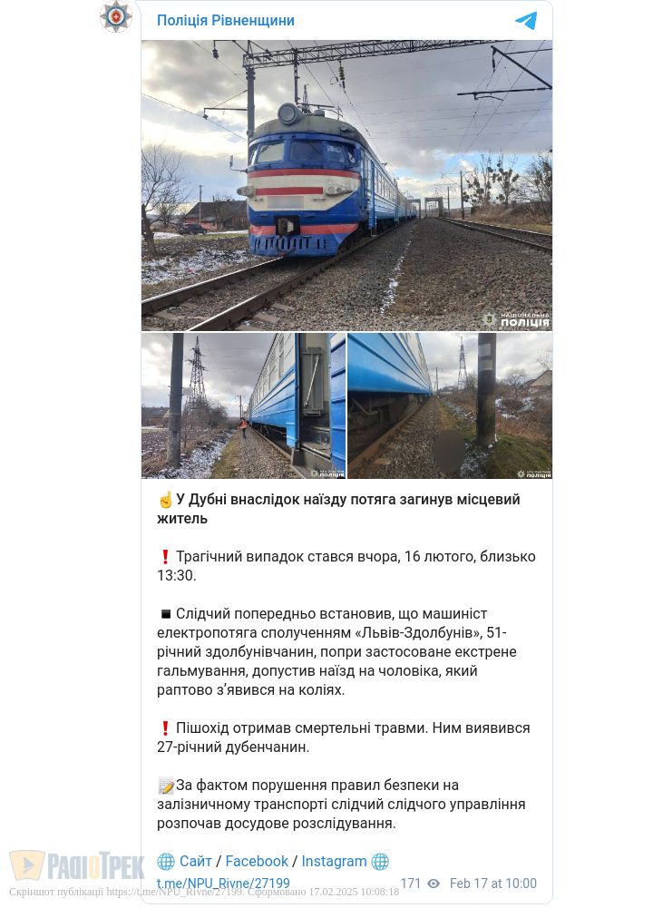 Правоохоронці попередньо встановили, що 51-річний машиніст електропотяга сполученням «Львів-Здолбунів», збив пішохода, який раптово зʼявився на коліях.