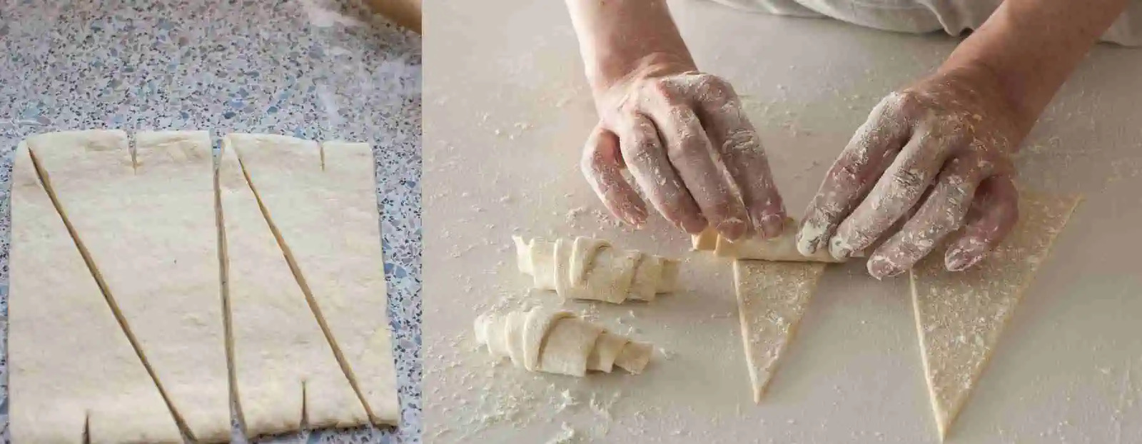Покладіть кілька шматочків шоколаду ближче до одного з країв кожного трикутника і сформуйте круасани.