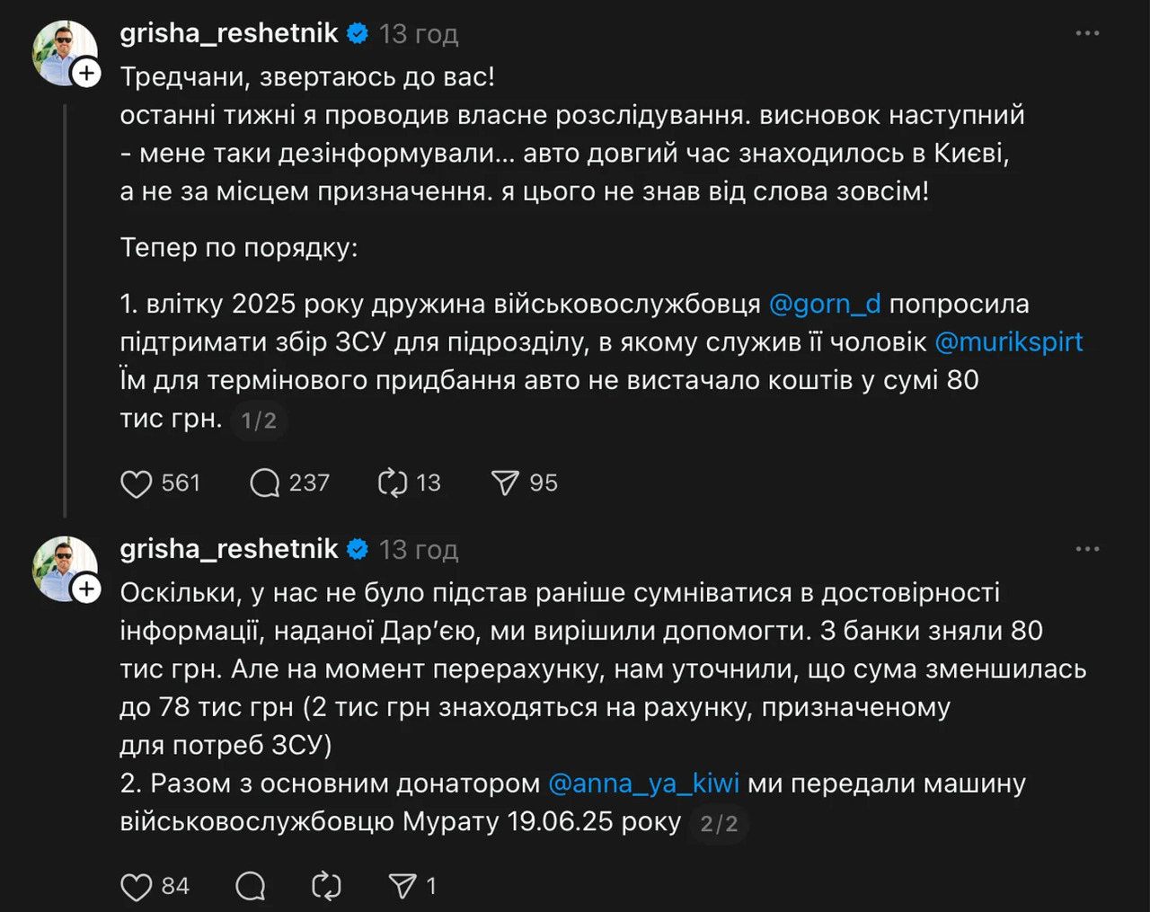 Решетнік повідомив, що авто вже на фронті та допомагає виконувати бойові завдання нашим захисникам. А 22 січня він уточнив ситуацію у Threads.