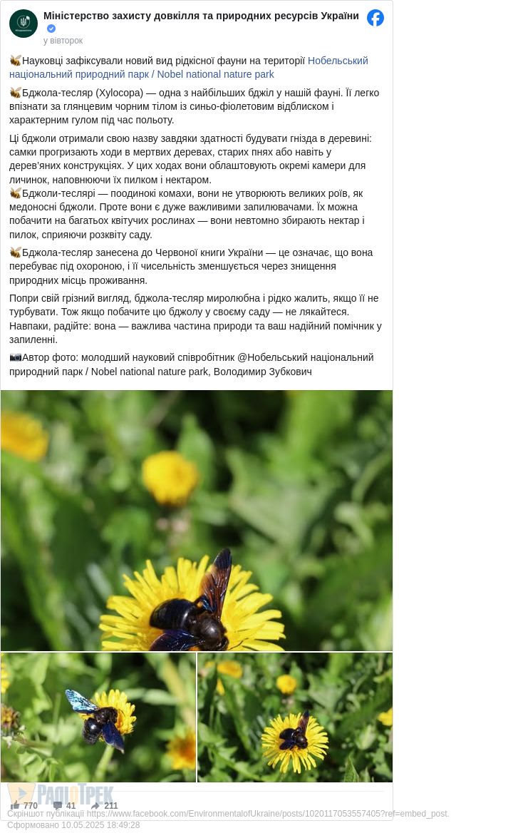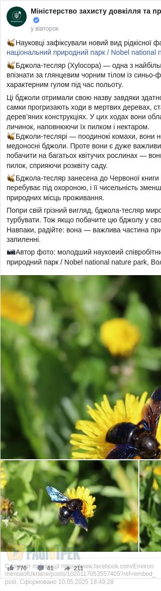 Бджола-тесляр — це одна з найбільших бджіл, що мешкають на території парку. Її легко впізнати за глянцевим чорним тілом із синьо-фіолетовим відблиском і характерним гулом під час польоту.