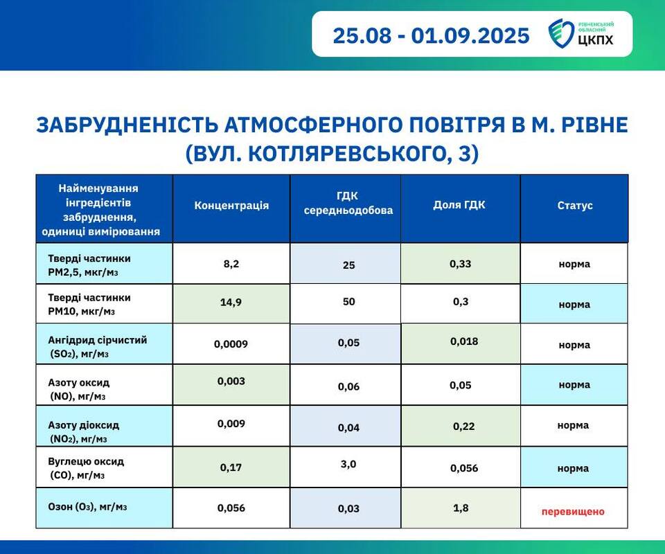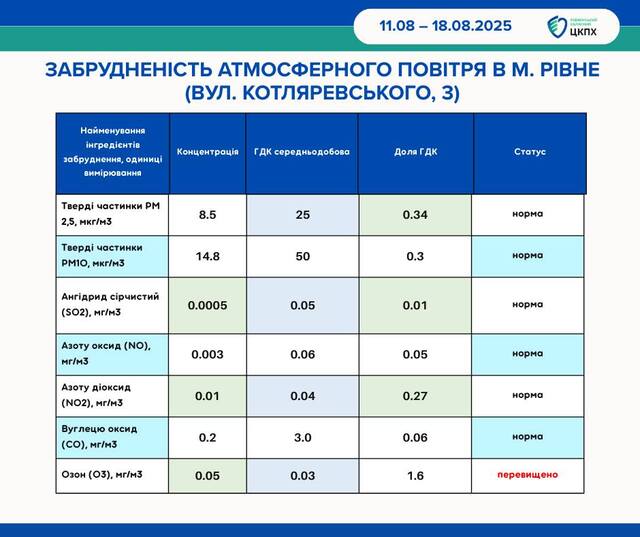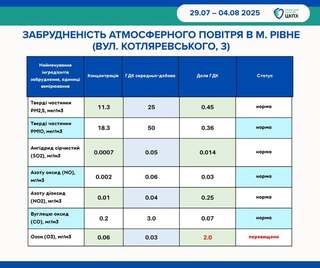 За останній місяць у Рівному були такі показники шкідливих домішок у повітрі: