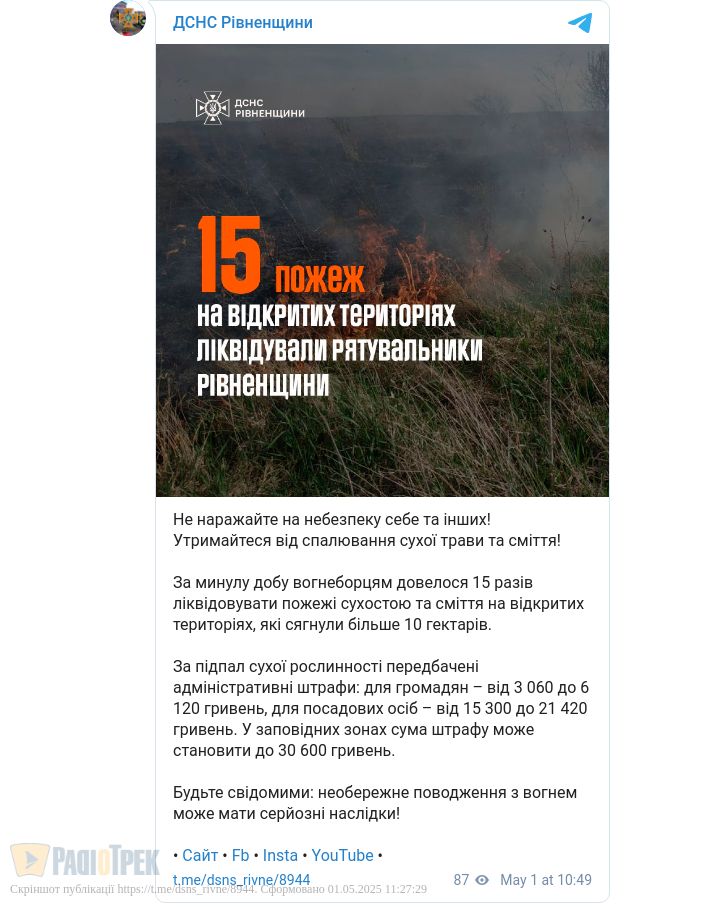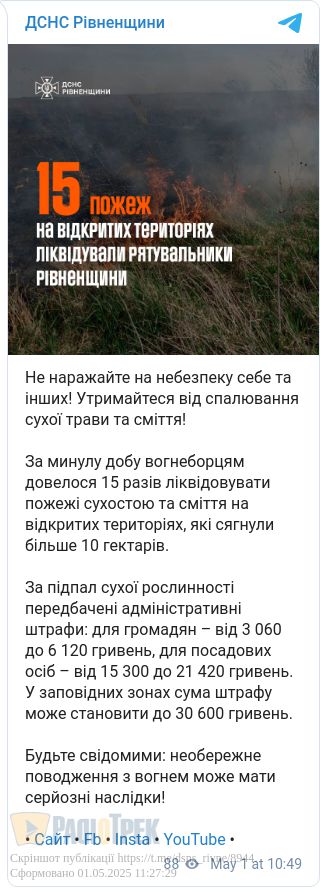 Нагадаємо, за підпали рослинності передбачені штрафи до 30 тисяч гривень, а в окремих випадках – кримінальна відповідальність.