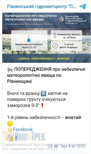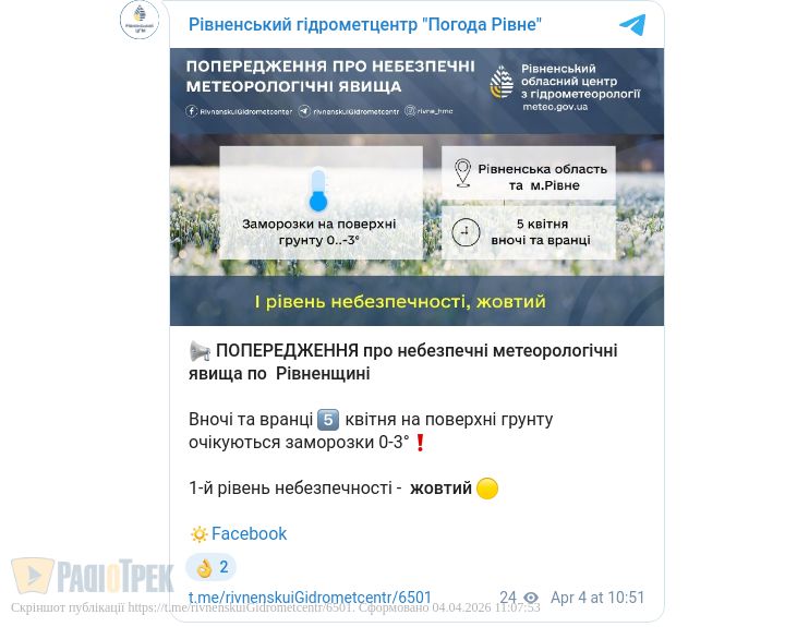 Найближчої ночі та завтра вранці у Рівному та області можливі заморозки на поверхні грунту. Очікується від нуля до -3 градусів.