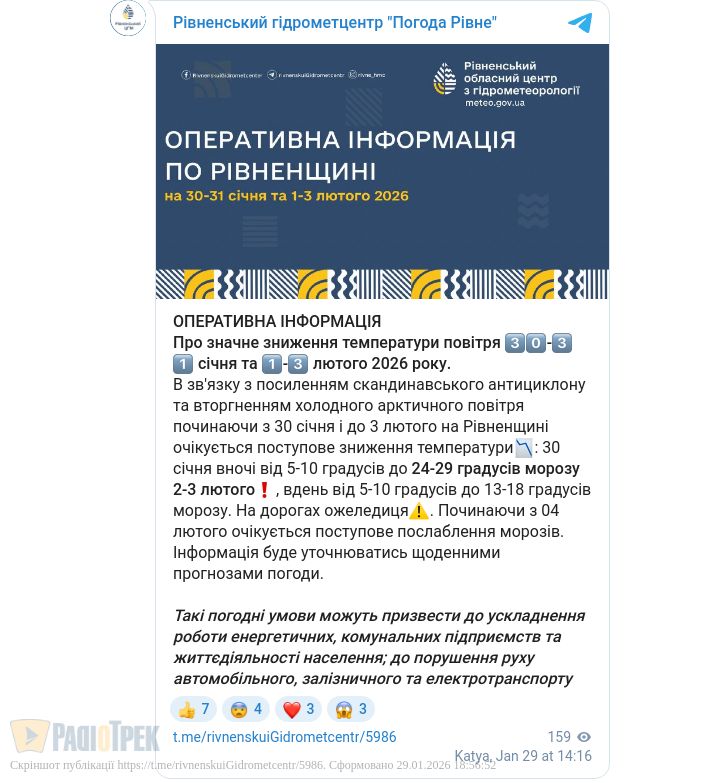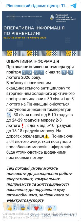 Пік морозів очікується 1-2 лютого, коли вночі стовпчики термометрів опустяться до -24...-29 градусів, а вдень очікується до -13...-18 градусів. На дорогах буде ожеледиця.