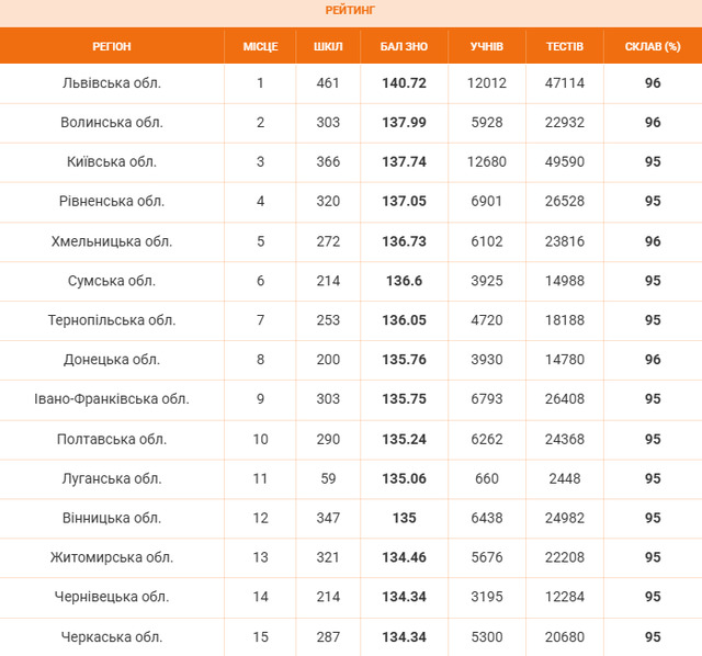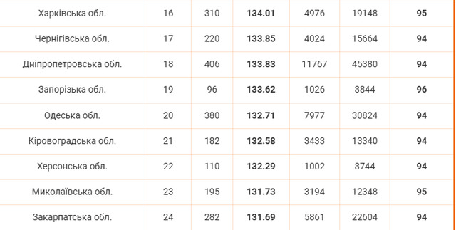 Загалом рейтинг областей України за результатами НМТ - 2025 виглядає так: