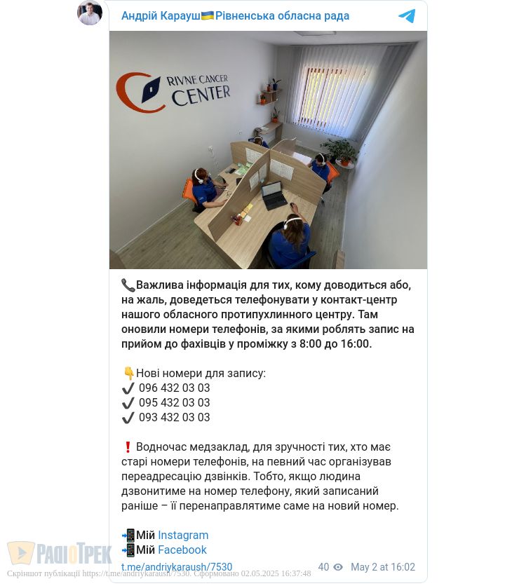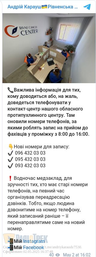 Рівненський обласний протипухлинний центр змінює номери телефонів реєстратури. За трьома контактами можна буде записатися на прийом до фахівців у період з 8:00 до 16:00.