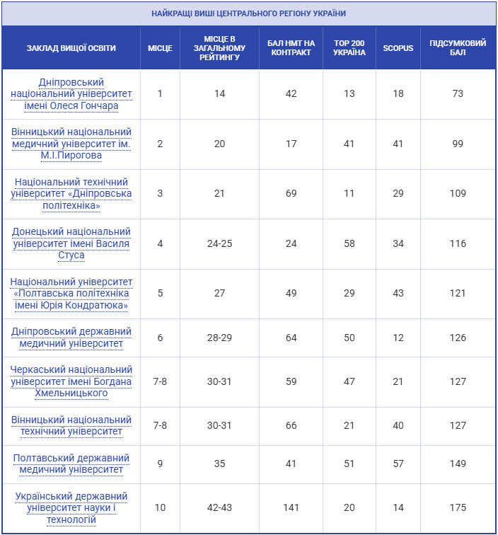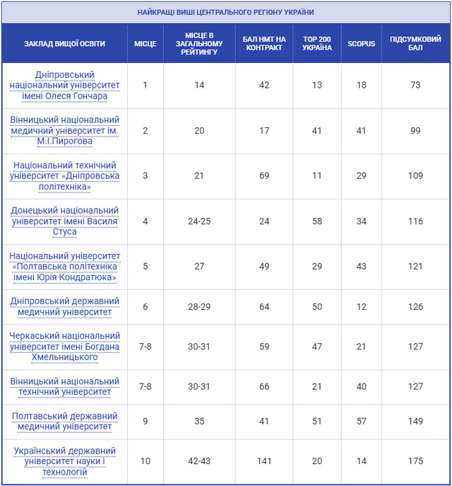 Центрального регіону – Дніпровський національний університет ім. Гончара.