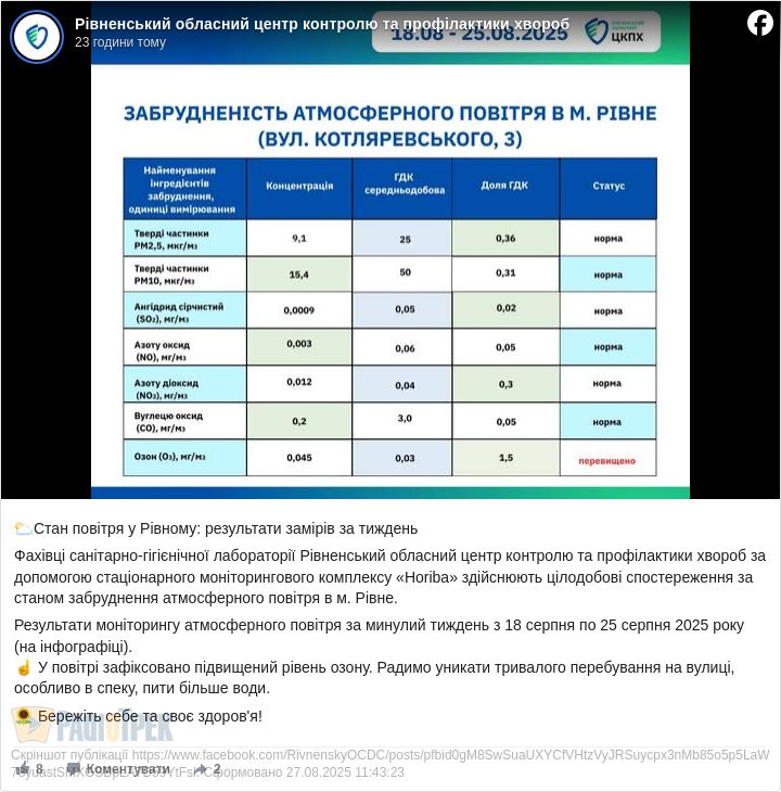 За даними обласного центру контролю та профілактики хвороб, з 18 по 25 серпня концентрація цього газу перевищувала норму в півтора раза.