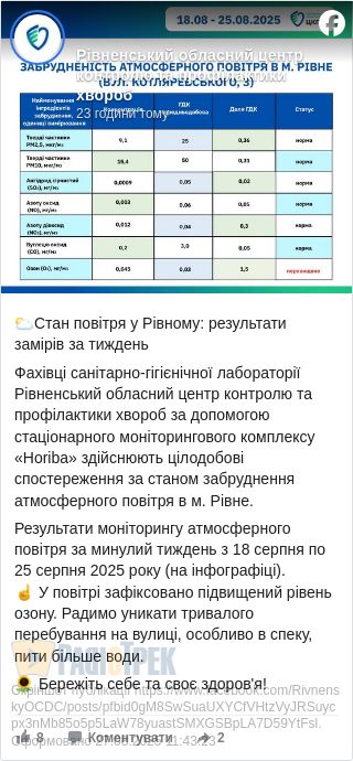 У Рівному другий тиждень поспіль фіксують підвищений рівень приземного озону.