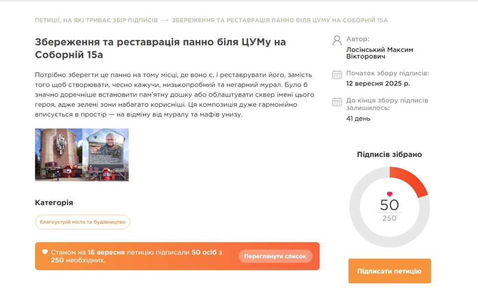 Автори звернення наголошують, що панно є важливою частиною міського простору, тож пропонують його відреставрувати. А як альтернативу — встановити пам’ятну дошку або облаштувати сквер імені героя.