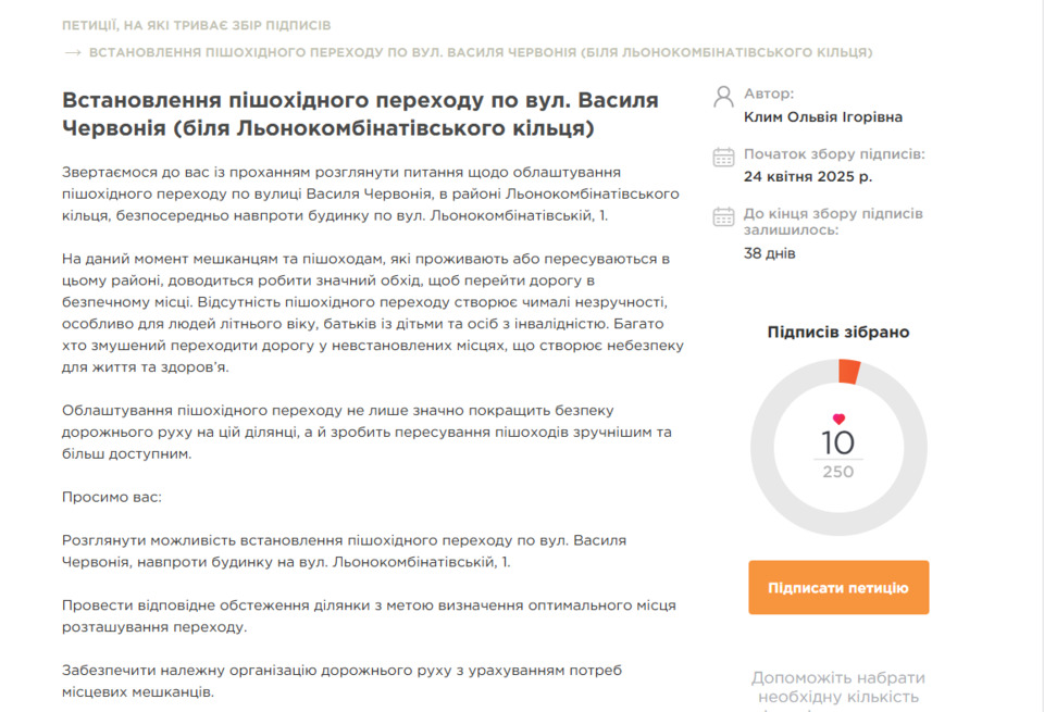Йдеться про ділянку поблизу Льонокомбінатівського кільця, і люди потребують переходу на вулиці Василя Червонія, поблизу будинку №1 на Льнокомбінатівській.