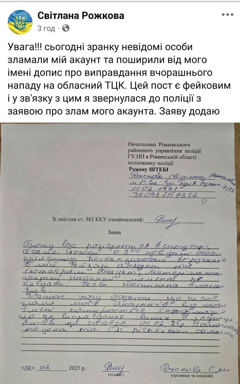 Відомо, що вона написала заяву до поліції про те, що її акаунт зламали і від її імені написали коментар. Цей документ оприлюднили у соцмережах.