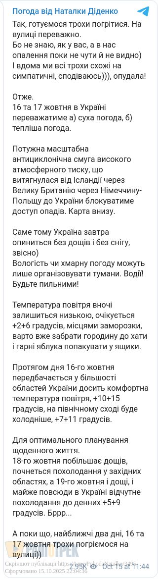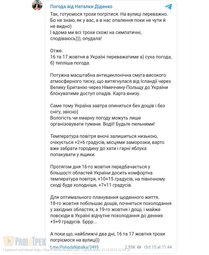 19 жовтня дощі поширяться на більшу частину країни, а температура повітря опуститься до +5...+9 градусів вдень, повідомила синоптик Наталка Діденко.