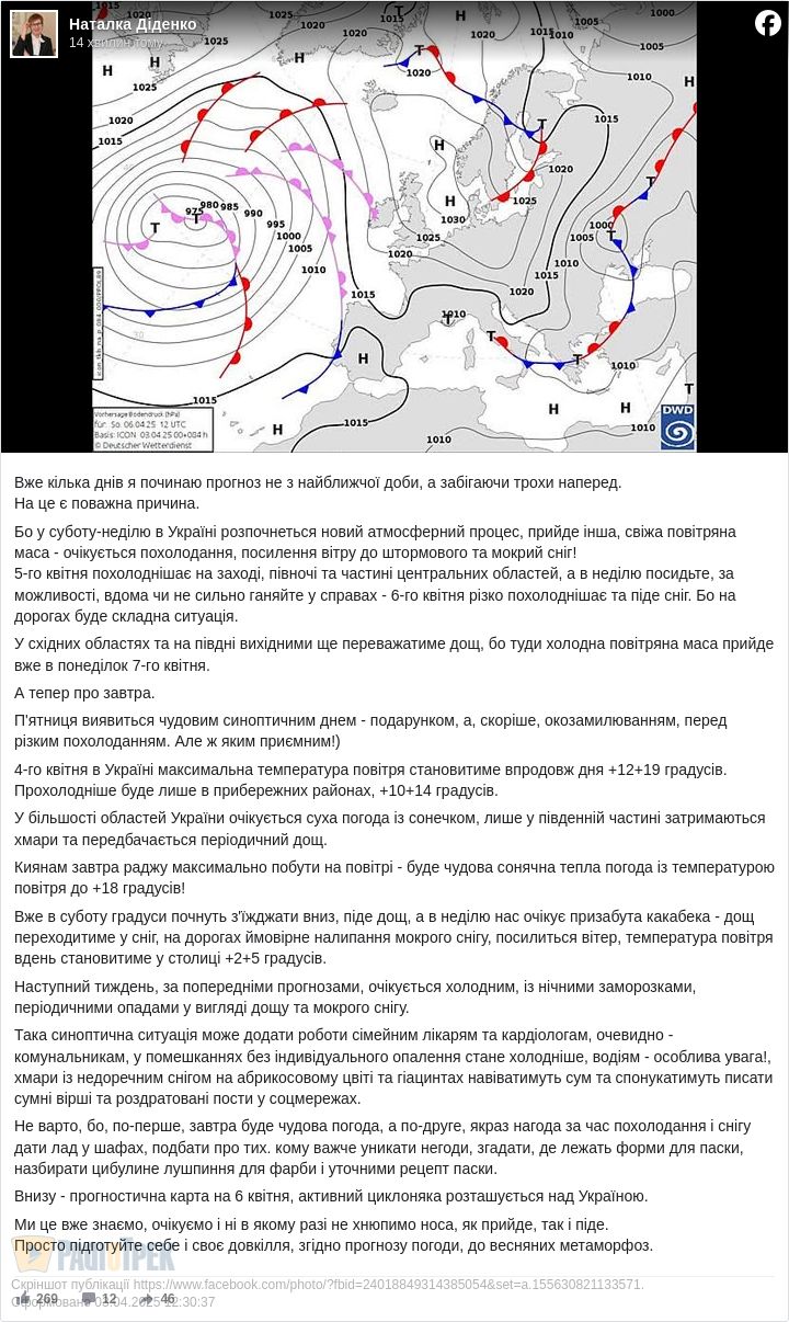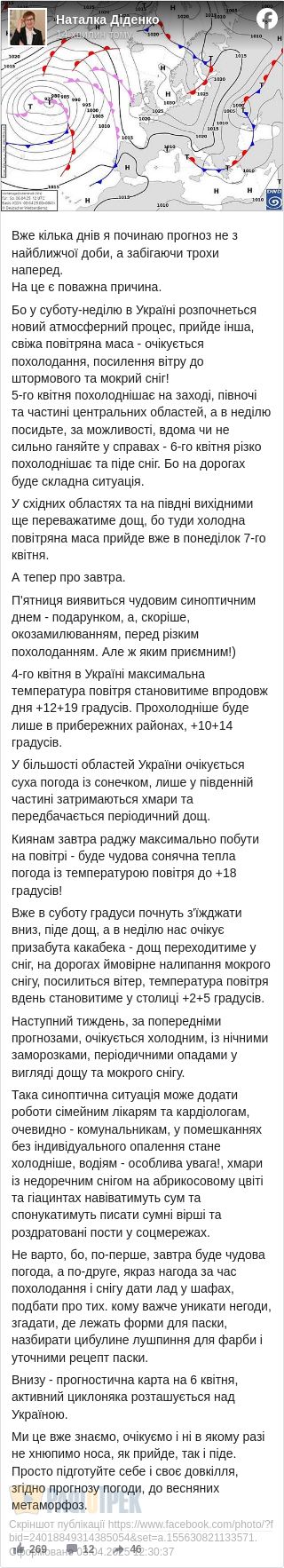 Вже 5 числа погода зміниться на Заході, Півночі та в деяких центральних областях. А у неділю негода посилиться. 6 квітня різко похолоднішає, піде сніг, на дорогах буде складна ситуація.