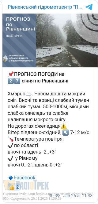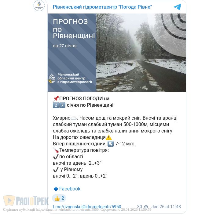 Часом пройде дощ та мокрий сніг. Вночі та вранці можливий слабкий туман 500-100 м. Місцями очікується слабка ожеледь та можливе налипання мокрого снігу. На дорогах буде ожеледиця, повідомили у Рівненському обласному гідрометцентрі.