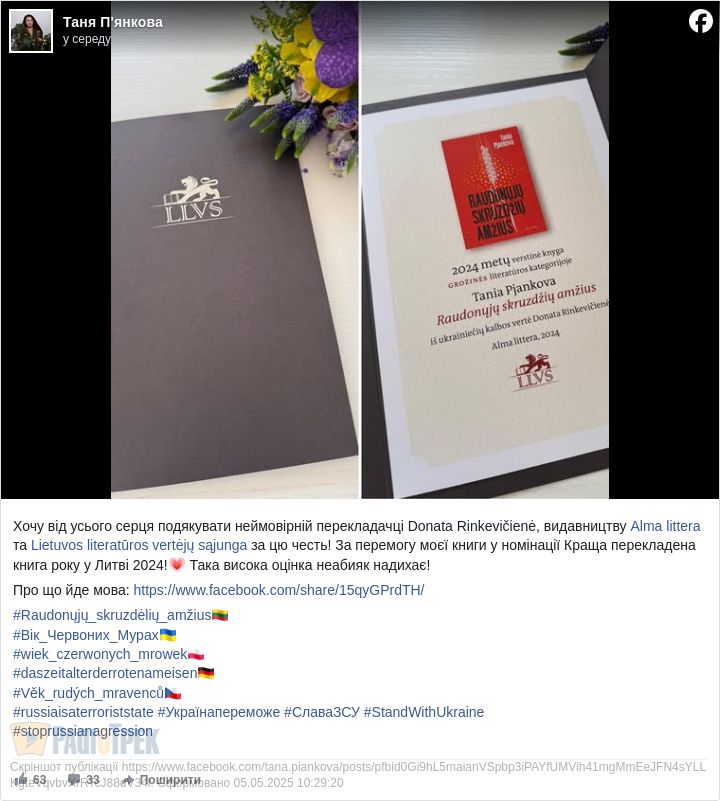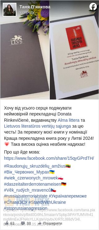Роман «Вік червоних мурах» української письменниці та видавчині Тані Пʼянкової здобув перемогу в номінації «Художня література» премії «Перекладена книга року», яку щороку присуджує Литовська асоціація перекладачів. Про це авторка повідомила на своїй сторінці у Facebook.