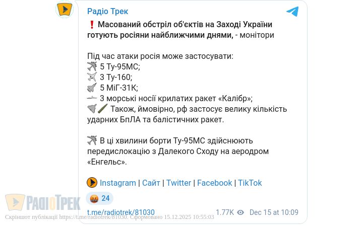 Станом на зараз у повітрі вже перебуває група стратегічних бомбардувальників Ту-95МС, які здійснюють передислокацію з Далекого Сходу на аеродром «Енгельс». За даними моніторів, це лише частина сил, які Росія планує залучити для чергової атаки.