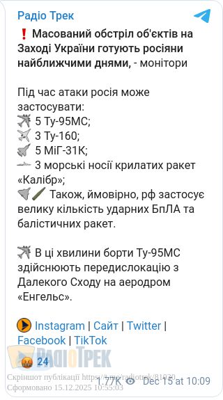 Моніторингові джерела попереджають, що основним напрямком майбутньої атаки можуть стати західні регіони України. За їхніми оцінками, Росія планує здійснити масований удар упродовж найближчих трьох діб.