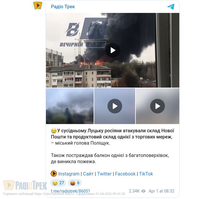 Російські окупанти сьогодні вранці атакували сусідній Луцьк. Під удар потрапили промислові об’єкти, зокрема термінал Нової пошти та продуктові склади. Внаслідок влучань у місті спалахнули масштабні пожежі.