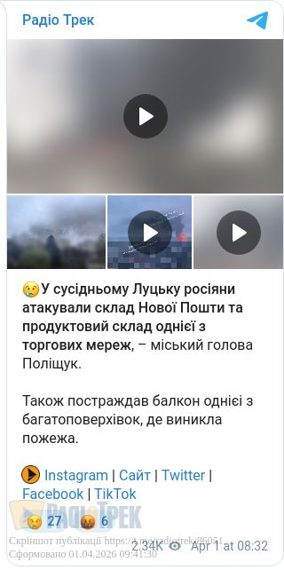 У «Новій пошті» підтвердили, що термінал у Луцьку повністю знищено. На момент атаки працівники перебували в укриттях, тож ніхто з персоналу не постраждав. Наразі триває оцінка руйнувань і збитків.
