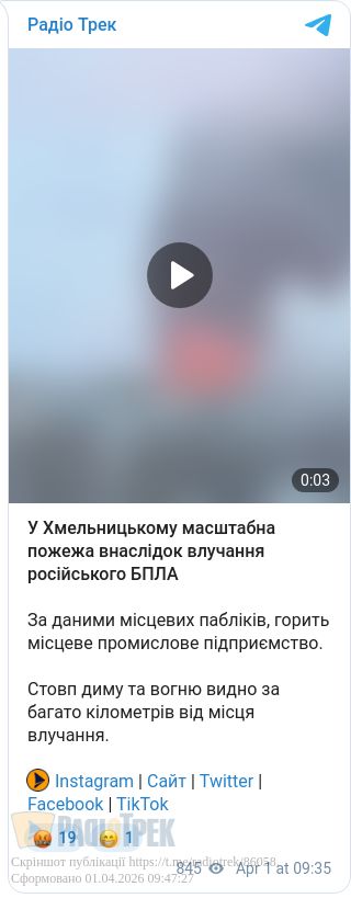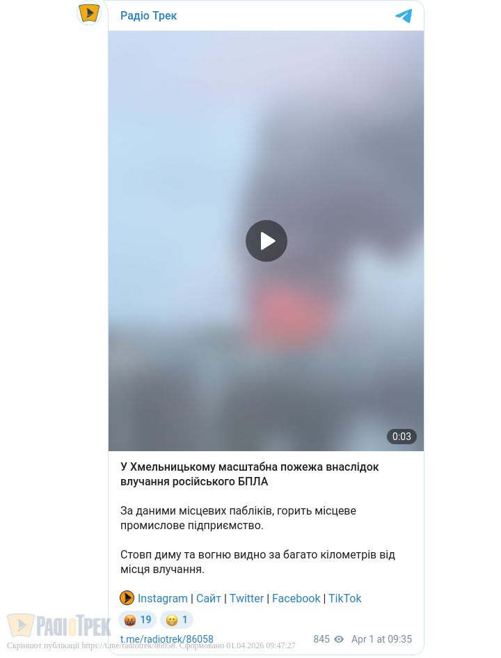 Також під атакою опинився сусідній Хмельницький. Там внаслідок влучання російського БПЛА виникла масштабна пожежа.