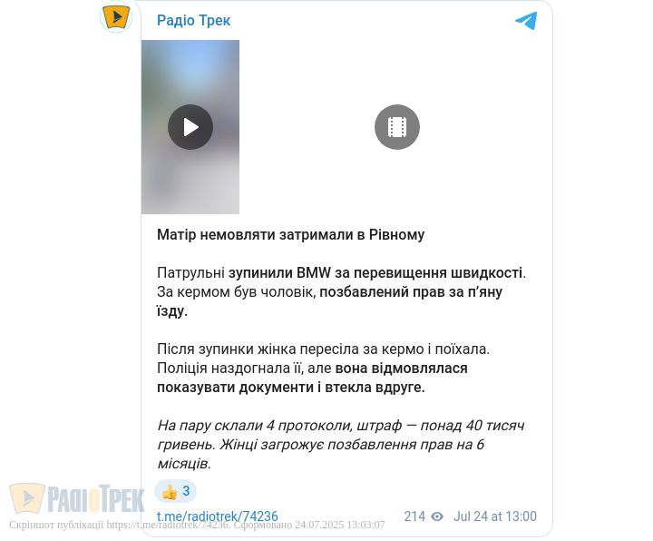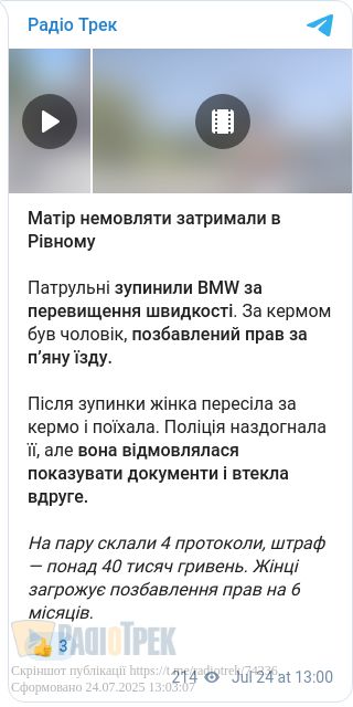 Виявилося, що на Дубенській патрульні зупинили BMW за перевищення швидкості. За кермом був чоловік, якого раніше позбавили права керування за їзду напідпитку. Окрім нього у салоні автівки була жінка і дитина, їм патрульні запропонували викликати таксі, щоб не чекати оформлення адмінматеріалів.