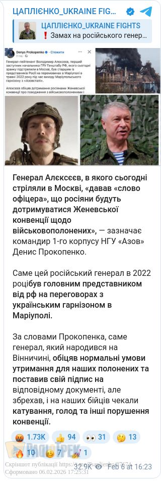 - Цей інцидент відбувся наступного дня після зустрічі російської та української делегацій – включаючи безпосереднього керівника Алексєєва в ГРУ Ігоря Костюкова – в Абу-Дабі, де обидві сторони обговорювали попередні результати мирних переговорів.