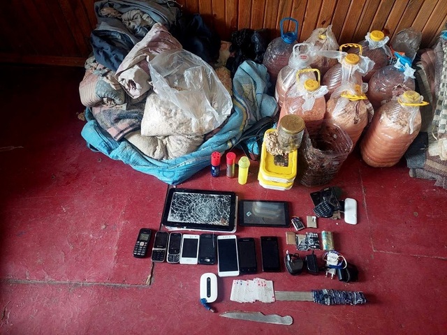 8 мобільних телефонів, Wi-fi-роутер, 2 пошкоджених планшета, 1,5 літрів спиртних напоїв кустарного виробництва, 5 батарей живлення до мобільних телефонів, 2 саморобні металеві пластини, 4 зарядних пристроїв до мобільного телефону, 45 л. саморобної хлібної закваски, понад 15 кг. саморобних хлібних дріжджів, а також поряд з цим куски електропроводки понад 10 метрів, різного роду саморобні нагрівальні пристрої, нетаврований інструмент, кип’ятильники та електричні тени, гральні карти саморобного виготовлення, нетаврований інструмент, заготовки дров, зайві речі та інші заборонені предмети та різного роду хлам.