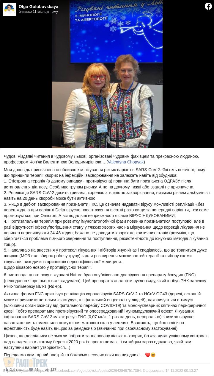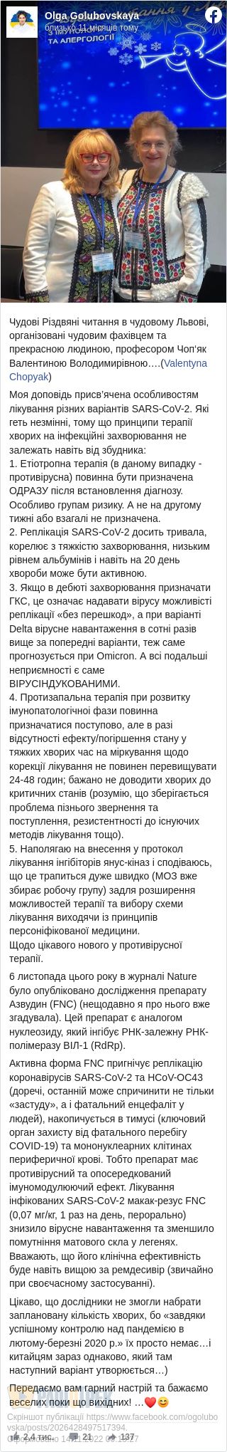 «Активна форма FNC пригнічує реплікацію коронавірусів SARS-CoV-2 та HCoV-OC43 (до речі, останній може спричинити не тільки «застуду», а і фатальний енцефаліт у людей), накопичується в тимусі (ключовий орган захисту від фатального перебігу COVID-19) та мононуклеарних клітинах периферичної крові», – пише Голубовська.