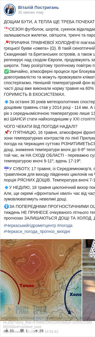 Між тим синоптик додав, що нинішній температурний фон відповідає середині квітня, а дощі вже виконали норму травня на 60%.