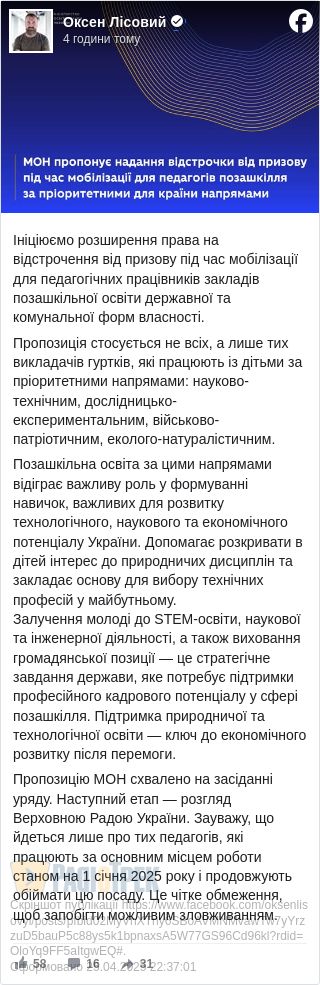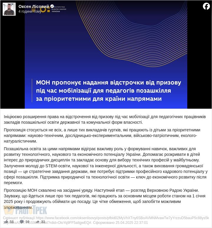 Міністр освіти і науки України Оксен Лісовий заявив про ініціювання права на відстрочення від призову під час мобілізації для педагогічних працівників закладів позашкільної освіти державної та комунальної форм власності.
