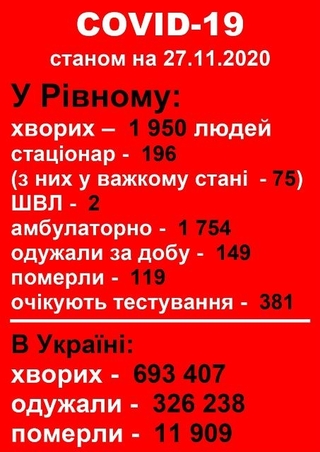 Таким чином, натепер у місті 1 950 активних хворих. Майже дві сотні осіб перебуває у лікарні, 75 рівнян у тяжкому стані, двоє підключені до апаратів ШВЛ.