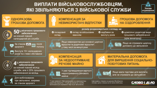 Звільнення з військової служби передбачає низку грошових виплат, які залежать від причин звільнення, тривалості служби та обставин, за яких вона припинилась. «Слово і діло» проаналізувало законодавство, актуальне для військовослужбовців, що звільняються у 2025 році.