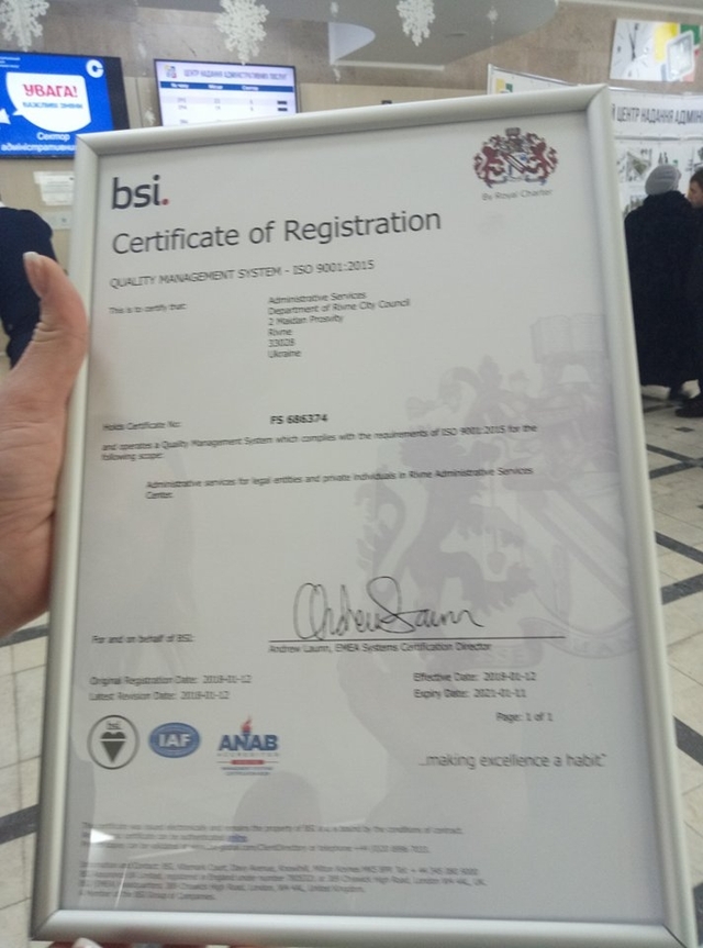 Така відзнака, за словами заступника міського голови, «говорить» світовим інвесторам, що з установою можна співпрацювати. Вручив сертифікат керівництву ЦНАПу міський голова Рівного Володимир Хомко. Зазначимо, що Британський інститут стандартів діє з початку 20-го століття й проводить сертифікацію якості роботи з клієнтами у різних галузях. Місто Рівне – перше в Україні, де виконавчі органи Рівненської міської ради проходять сертифікацію відповідно до міжнародного стандарту такого рівня.