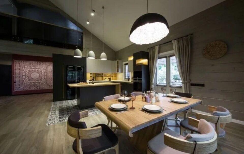 Великі панорамні вікна, багато простору, сучасний і дуже стильний ремонт, гарні меблі та багато сонячного світла – ось як можна описати гніздечко Олени Кравець. У кухні можна побачити великий стіл, за яким зручно збиратись усій родині, а також простору робочу поверхню – там господиня готує смачні страви для своїх рідних.