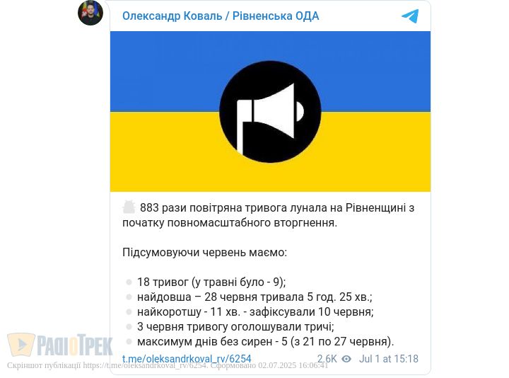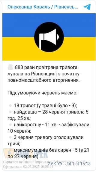Шокуючі цифри: відомо скільки повітряних тривог пролунало на Рівненщини у червні