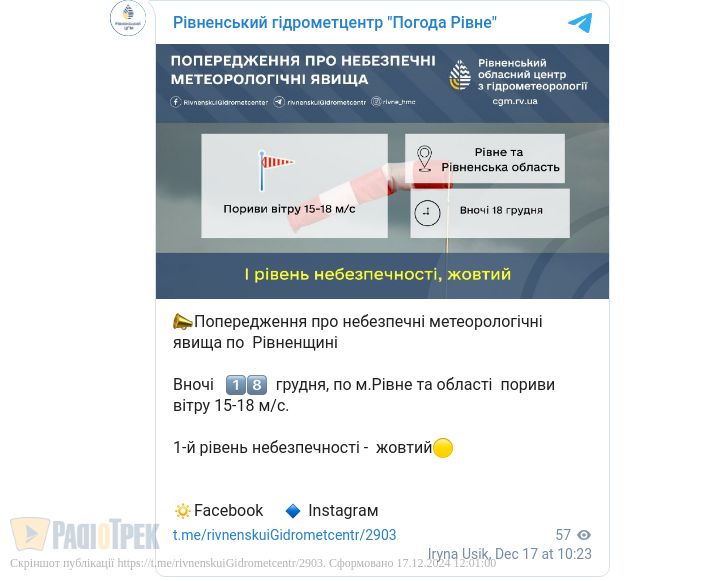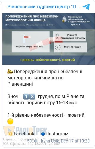 Вітер буде західний та південно-західний, вночі з поривами до 15-18 м/с. Це І рівень небезпеки, «жовтий», повідомили у Рівненському гідрометцентрі.