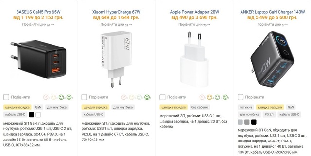 На E-katalog зручно порівнювати зарядні пристрої за потужністю, типом роз’ємів, кількістю портів і ціною. Користувач бачить реальні пропозиції ринку та може підібрати оптимальний варіант як для одного гаджета, так і для всієї екосистеми пристроїв.