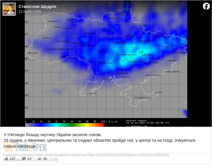 Завтра, 26 грудня, більшу частину України засипле снігом. Про це повідомив народний синоптик Станіслав Щедрін.