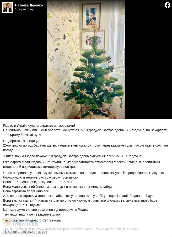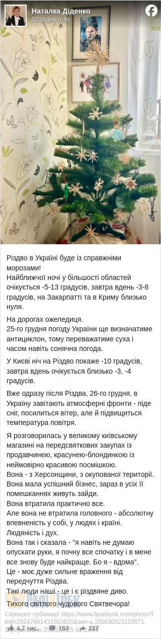Снігопади прогнозує й синоптик Наталка Діденко. За її словами, 26 грудня в Україну завітають атмосферні фронти. Піде сніг, посилиться вітер, а температура повітря підвищиться.