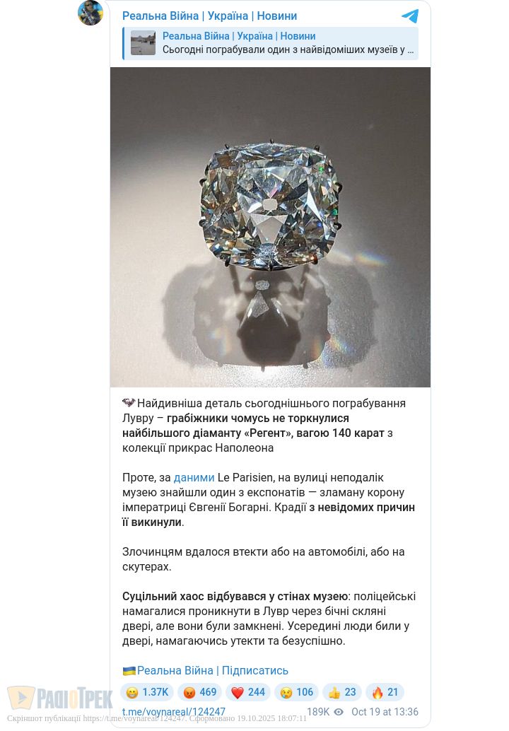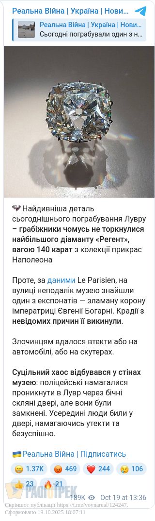 Недалеко від музею було знайдено корону імператриці Євгенії (дружини Наполеона III). Реліквія була пошкоджена. Пошуки інших викрадених цінностей тривають, повідомляє Le Parisien.
