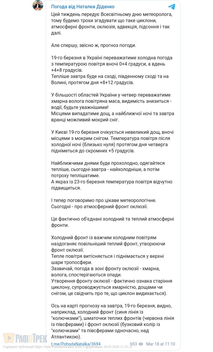 Синоптик Діденко попередила українців про дощ з мокрим снігом