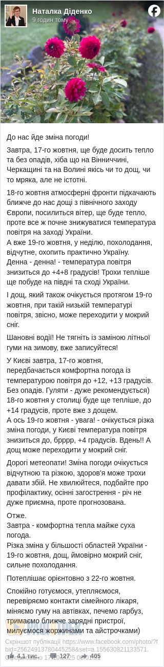 Вдень температура повітря знизиться до +4...+8 градусів. Лише на Півдні та Сході країни буде трохи тепліше, повідомила синоптик Наталка Діденко.