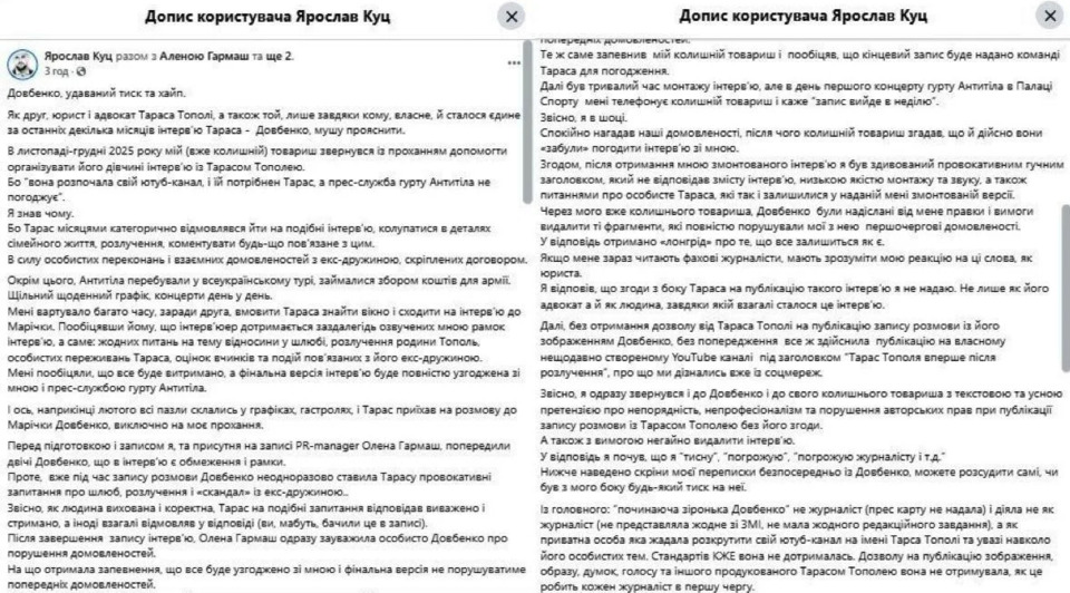 Навколо лідера гурту «Антитіла» Тараса Тополі спалахнув гучний конфлікт через інтерв’ю блогерки Марічки Довбенко, в якому зачіпали особисте життя артиста, зокрема його розлучення з Оленою, пише ТСН.