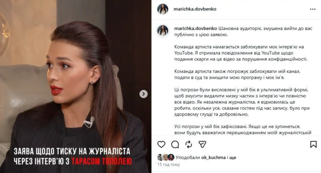 Команда Тополі наполягає на видаленні відео, стверджуючи, що були порушені домовленості про теми розмови, а журналістка звинувачує їх у тиску та погрозах.