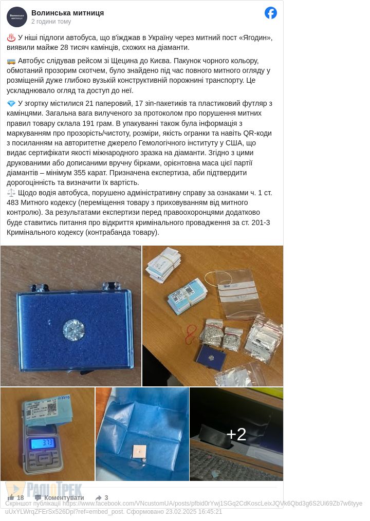 На пункті пропуску «Ягодин», що на Волині, прикордонники зупинили автобус, у ніші підлоги якого знайшли майже 28 тисяч камінців, ймовірно, діамантів вагою 191 грам.