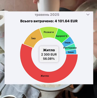 Місяць ще не закінчився, а вона вже витратила 4 101 євро. Найбільшу частку цих грошей, понад половину, доводиться віддавати за будинок – 2 300 євро.