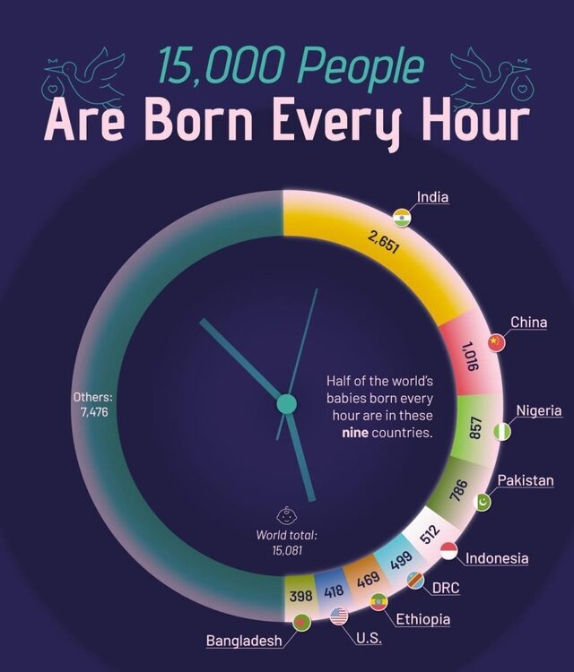 На першому місці — Індія, де народжується понад 2600 дітей щогодини. Для порівняння: у Китаї, який посів друге місце, цей показник удвічі нижчий — близько 1000 немовлят на годину.